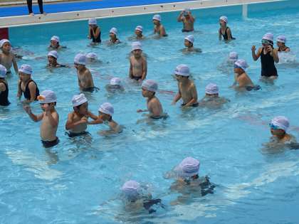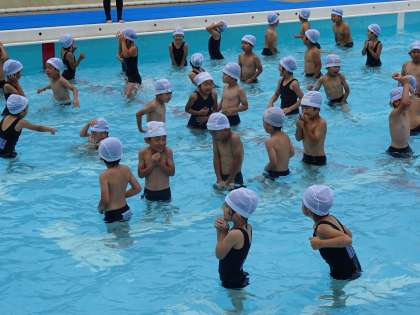 最初プールに入ったときは少し寒そうにしている子もいましたが、徐々に子ども達も慣れてきて、水の中でいろいろな動きをして活動していました。