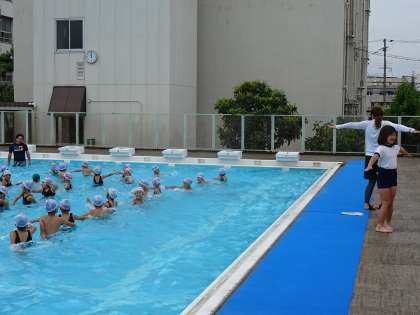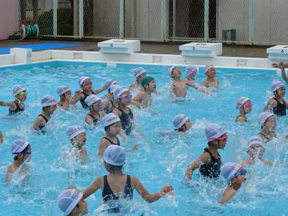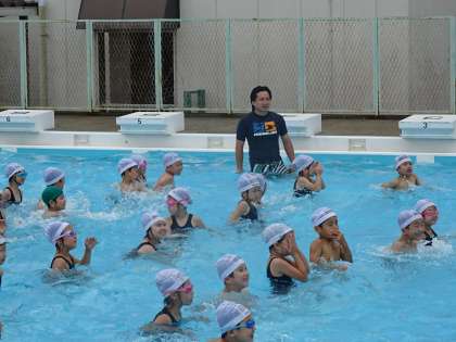 曲にあわせて先生の見本の動きをまねしながら、子ども達は水慣れの活動を楽しんでいました。