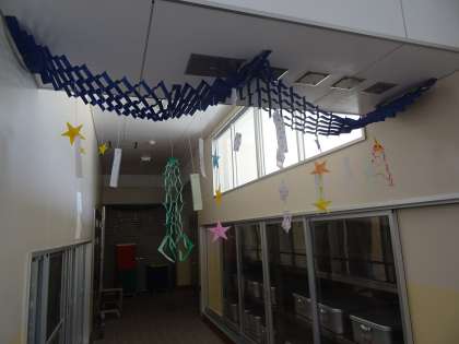給食調理員さんたちが忙しい仕事の合間をぬって、またステキな飾りをたくさん作ってくれました。