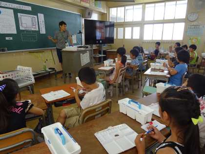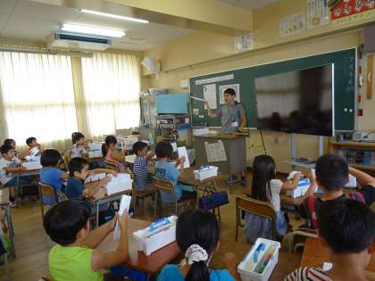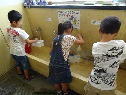 水の入れ方やパレットの使い方など、初めてふれる道具の使い方を先生が丁寧に説明し、子ども達は真剣に聞いていました。