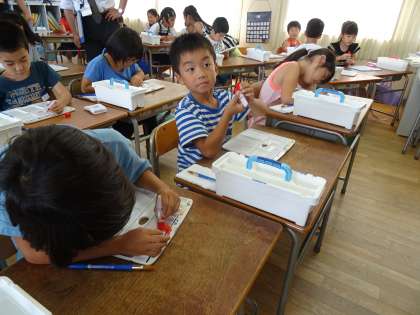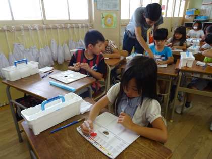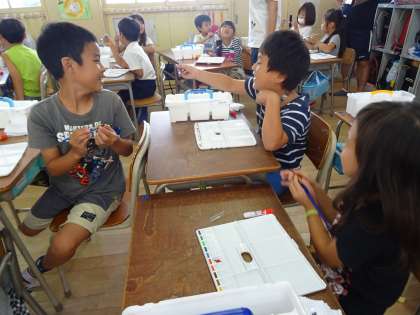 初めてパレットに絵具をいれるときには、子ども達はドキドキしながらも慎重にいれていました。
