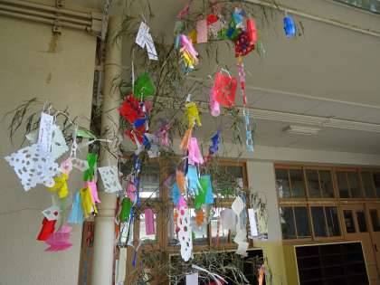 1年生がつくった七夕の飾りや願い事が、笹に飾られ掲示してあります。