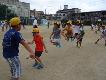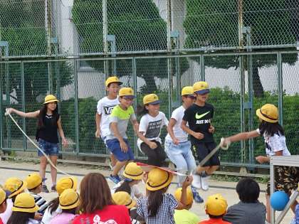 スポーツ集会として、たてわり班で大なわとびをしました。