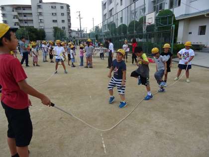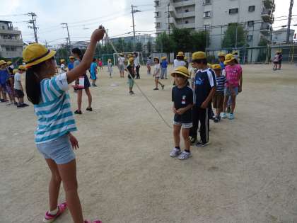 班長と副班長がなわをまわし、みんなで跳んだり、順番に跳んだりして楽しそうに活動をしていました。