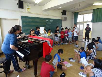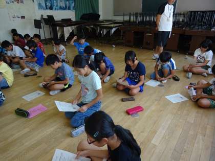 5年生は夏休み中に行く自然体験学習にむけて、キャンプファイヤーの時に歌う歌をみんなで練習しました。子ども達は本番が待ち遠しいといった様子で楽しみながら練習に励んでいました。