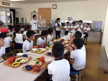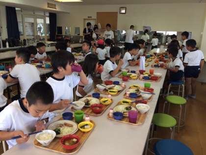 朝の集いで元気よく体操をしたあと、朝食を食べました。