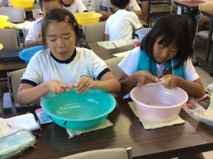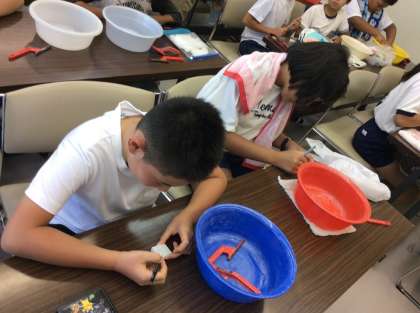 今日は、滑石という石で削り作りました。ヤスリを使って真剣な表情で削り、思い思いの素敵な勾玉ができました。