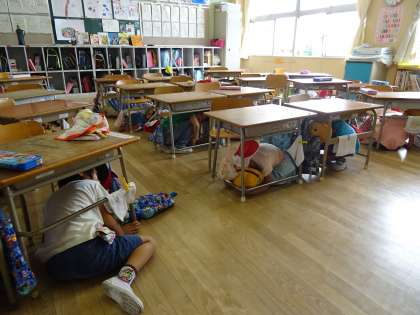 地震が起こった時の対応(机の下に入る)なども、子ども達はしっかりとおこなっていました。