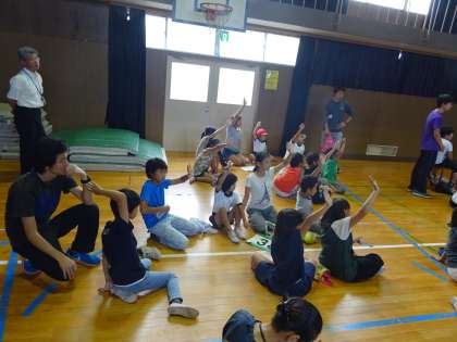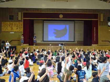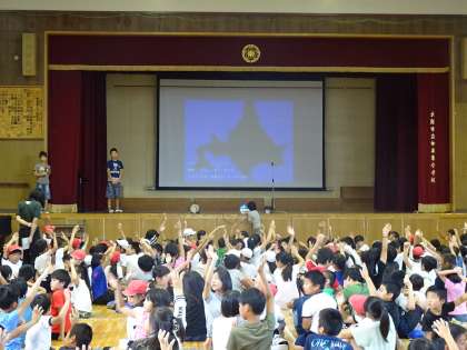 今日の集会は、シルエットゲームをしました。影の形を見て、子ども達は答えは何かを班で相談して考えていました。