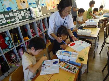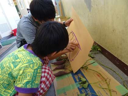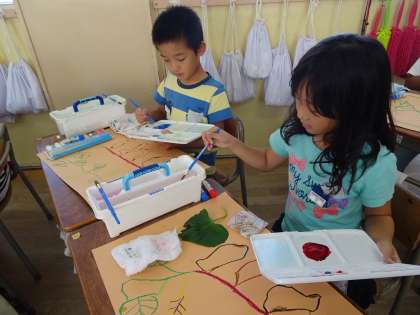 今日は絵具を使って色塗りをしました。絵具をまぜて色をつくることを教えてもらった子ども達は、上手に色を混ぜてさつまいもの色を表現していました。