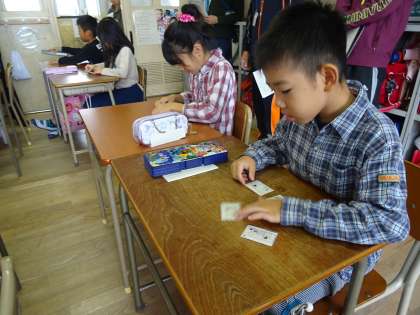 今日は4コマ漫画を使って学習をしました。ばらばらになった4コマの場面を並び変えたり、絵をもとに簡単な文章を考えたりしました。
