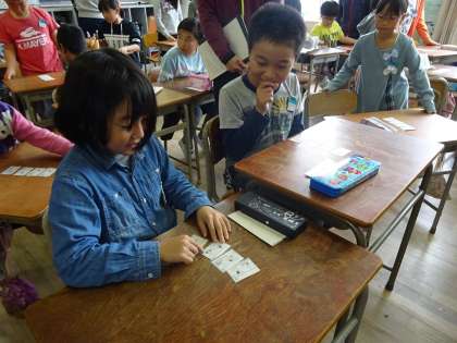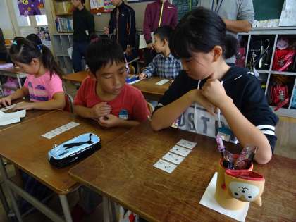 ばらばらになった4コマを自分で並び変え、友だちと意見を交換しあい、一生懸命に場面を想像していました。
