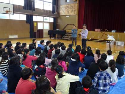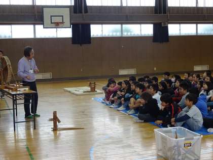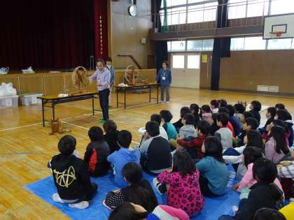 講師の方々に来ていただき、綿について教えてもらったり、綿から糸にする作り方を教えてもらったりしました。綿から糸ができていく様子に子ども達はとても驚いていました。
