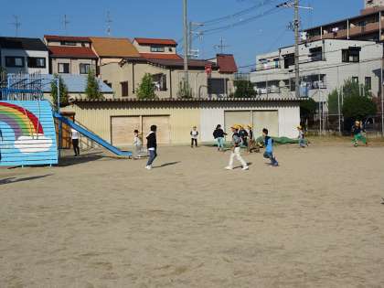 運動場のいろいろなところにある宝を班のみんなで探しました。高学年は低学年の手をつないで一緒に探したり、宝を見つけたら低学年の子に渡したりして優しさをもって接している場面があちらこちらで見られました。