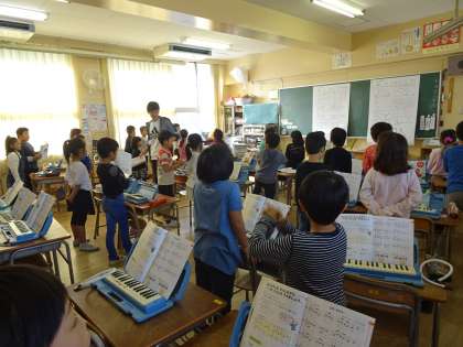 2年生の音楽の学習では、今日も元気な歌声が教室中に響いていました。リズムに合わせて手拍子をしたり、笑顔で歌ったりと子ども達は歌うことをとても楽しんでいました。