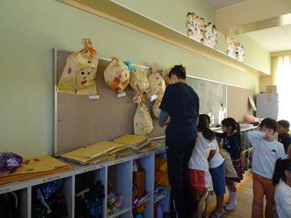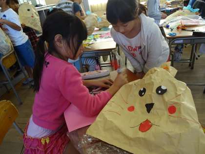 2年生の図工の学習では、袋に動物の絵をかいてふくらませた作品を作っています。