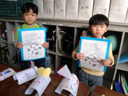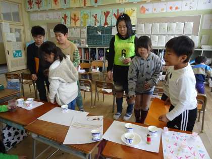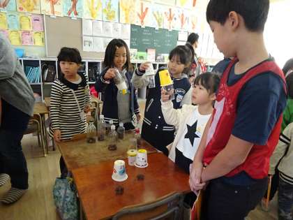 1年生の教室では、どんぐりを使ったいろいろな遊び道具での体験をしました。