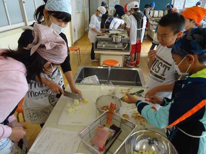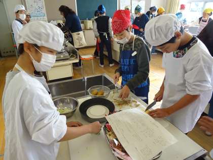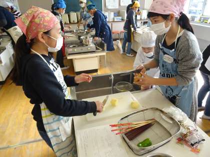 6年生は家庭科の調理実習で、ジャーマンポテトとピザを作りました。