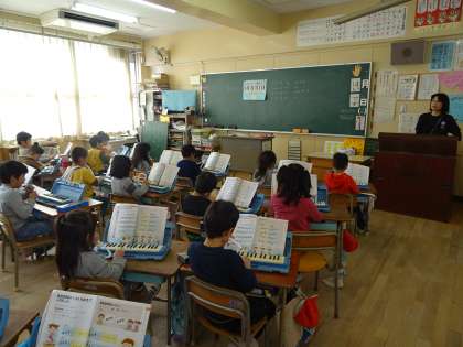 これまで練習してきた指使いも随分と上達し、子ども達は上手に音をだし、先生の伴奏に合わせて演奏していました。