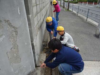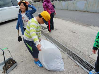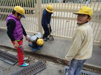 学校まわりに落ちている落ち葉やごみを、楽しみながらもみんなで協力して、きれいに掃除していました。