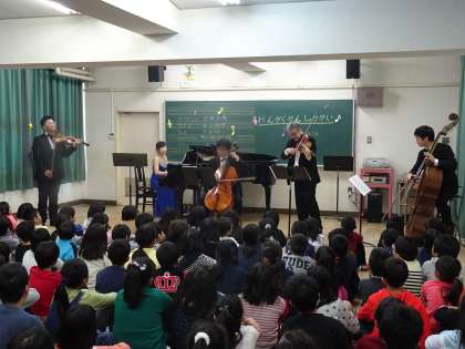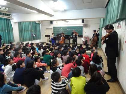 音楽鑑賞会として、willのみなさんに来校していただき、音楽室でミニコンサートをしていただきました。