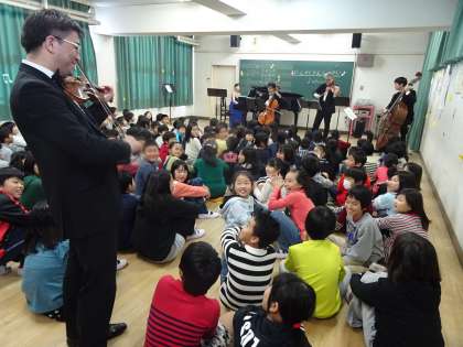 子ども達は自分たちのすぐ近くでの演奏やそれぞれの楽器の奏でる音に聴き入っていました。それぞれの楽器の紹介をしてもらったり、音楽の楽しみ方を教えてもらったりするなどして、子ども達は鑑賞会を楽しんでいました。