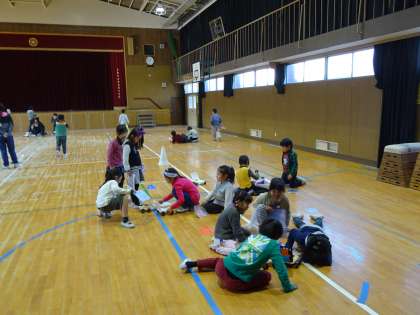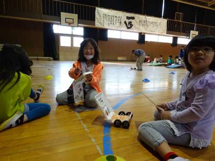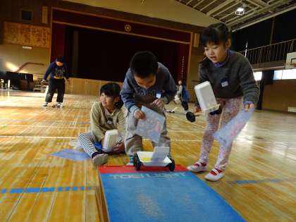 2年生は生活科でつくった動くおもちゃを使って、講堂で活動しました。いろいろなコースをつくって走らせたり、友だちと一緒におもちゃを動かしたりして、子ども達はとても楽しそうに活動をしていました。