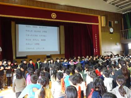 6年生の子ども達が前に出て、みんなで手をつないで歌を歌い、笑顔あふれる中で歌うことができました。