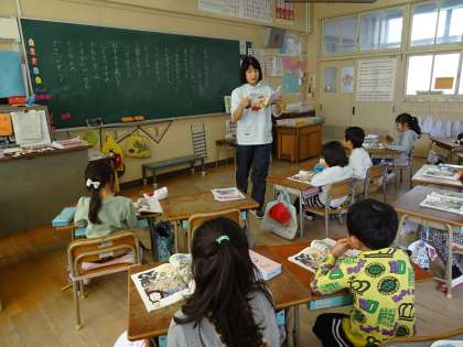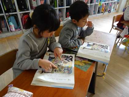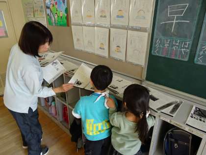 教科書にのっている昔話の絵を見て話し合ったあと、先生が用意した昔話のプリントを子ども達は読みました。たくさん用意された昔話のプリントを子ども達は一生懸命に読んで、楽しんでいました。