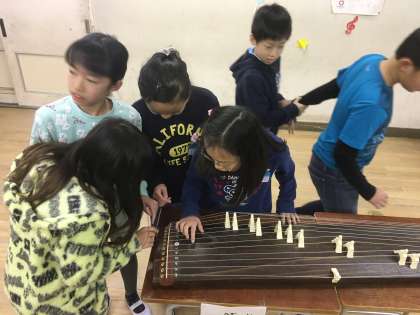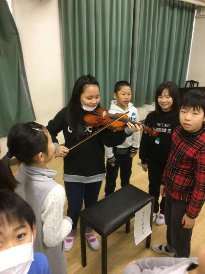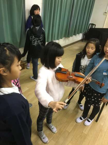 4年生の音楽の学習で、三味線やバイオリンなどの楽器を先生が用意し、本物の楽器に子ども達はふれました。子ども達は「どうやって音を出すのかな」「どうやってこの楽器を持つのだろう」など、興味関心をもって楽器体験をしていました。