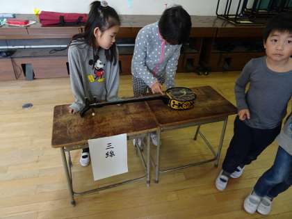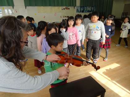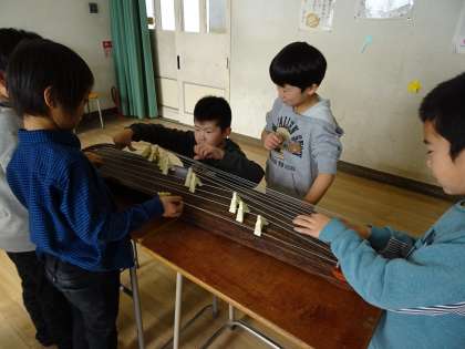 2年生の音楽の学習でも、本物の楽器にふれる体験をしました。子ども達は初めてさわる楽器に興味津々でした。