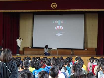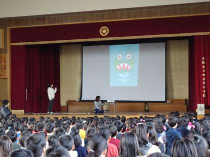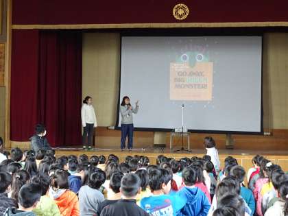 英語朝会がおこなわれ、スクリーンを使っての絵本の読み聞かせを子ども達はしてもらいました。絵本に出てくるモンスターが変化していく様子を楽しんだり、「GO AWAY(ゴーアウェイ)」のセリフをみんなで言ったりして、英語に親しんでいました。