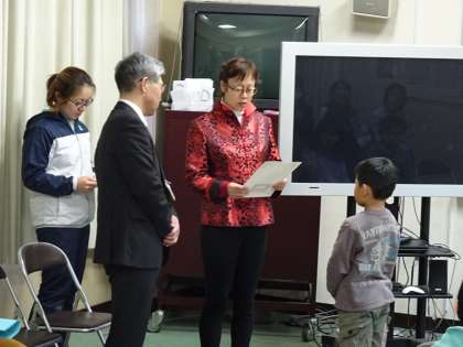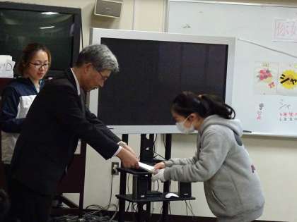 発表の後、子ども達は修了書を校長先生と老師から渡してもらい、笑顔で受け取っていました。