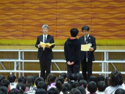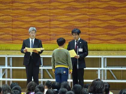「がんばる小学生」として、あいさつや清掃など、日頃からがんばって取り組んでいる子ども達に平野区長から表彰をうけました。