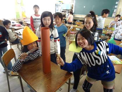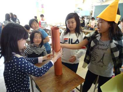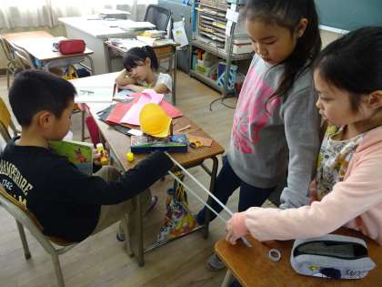 物語を劇にして学習を深めることになり、子ども達は劇で使う小道具を作りました。グループの友だちと協力しながら、子ども達は楽しそうに活動していました。