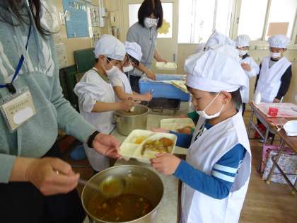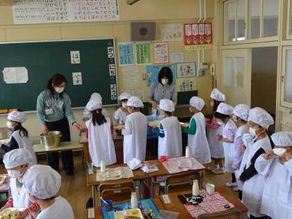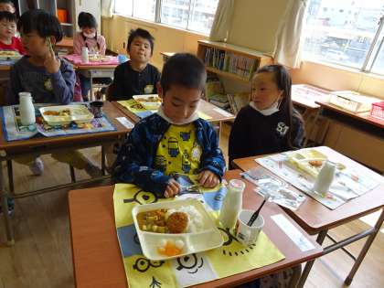 1年生は初めての給食にドキドキわくわくしながら、自分たちで配膳したり、食べたりしていました。