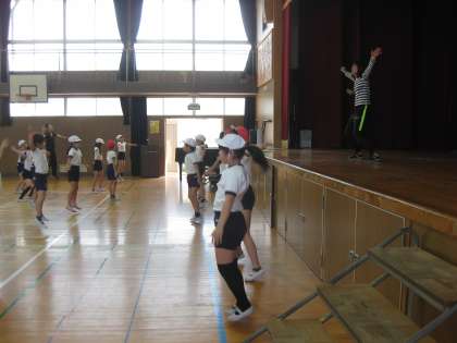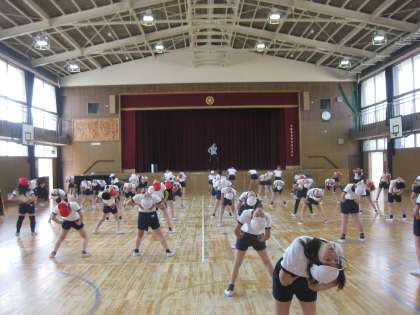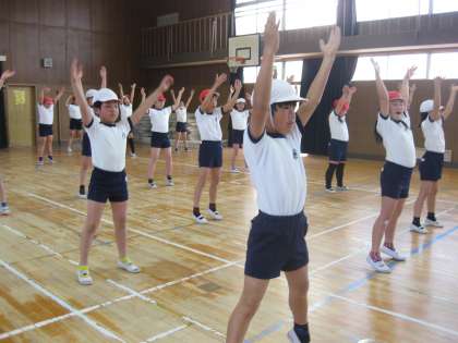準備運動でラジオ体操をしました。伸ばすところはしっかり伸ばし、曲げるところはしっかり曲げる。体育係を中心として、積極的にからだをほぐすことができました。シャトルランの準備ができました。