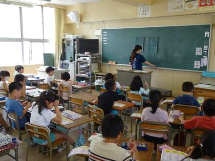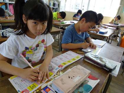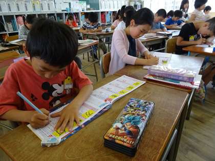 2年生の子ども達は、新しい漢字の説明をしっかりと聞いて、丁寧に字を書いてがんばっています。字のチェックをしてもらうときに先生に褒めてもらうと、とても嬉しそうな顔をしていました。