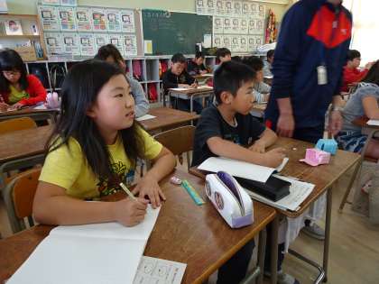 「発芽には何が必要かな、予想してかいてみよう」との、先生の問いかけに子ども達はじっくりと考えて答えを書いていました。