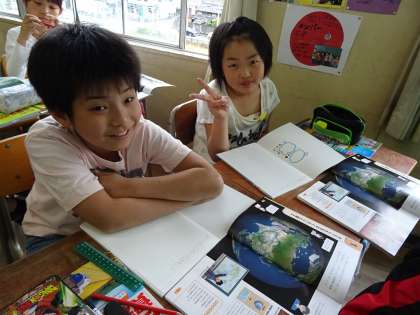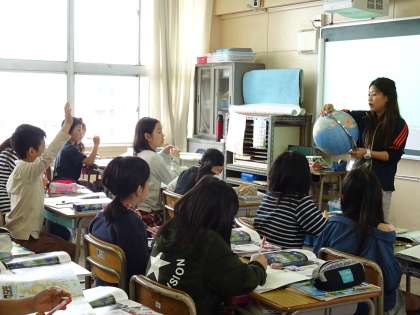 「地球儀を見て気づいたことはあるかな」と先生が質問すると、先生の持ってきた地球儀や教科書をよく見て、子ども達は見つけたことを意欲的に発表していました。