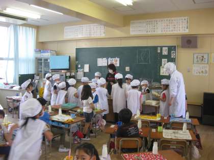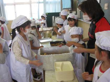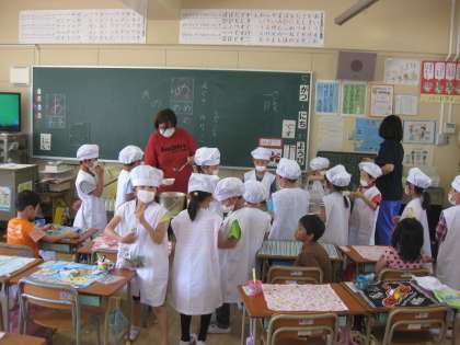 5月になり、給食も自分たちで用意、配膳をしました。それぞれの先生の話をよく聞きながら、テキパキと配ることができました。片づけも積極的に行いました。