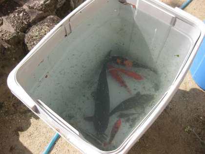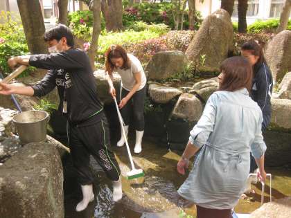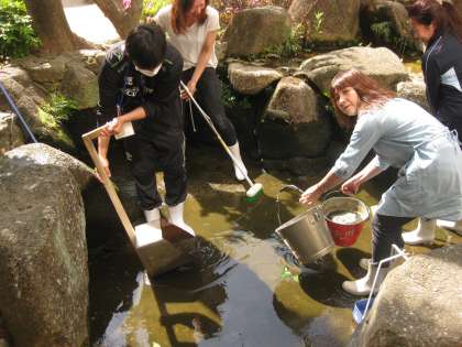 教職員で池の掃除をしました。汚れていたところを中心にブラシで丁寧にこすりました。魚たちも元気そうです。
