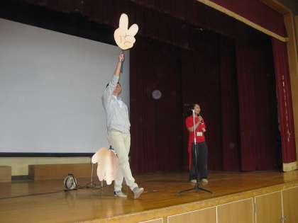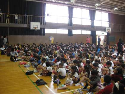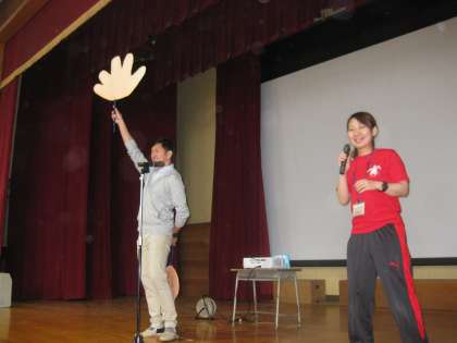 今日の英語集会は、「英語でじゃんけん」でした。ただじゃんけんをするだけでなく、「WIN!」「LOSE!」「TIE!」と、勝ち、負け、あいこも英語で表現できました。ジョマル先生の出した大きな手にみんな楽しんでいました。