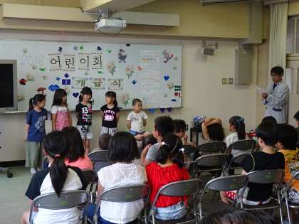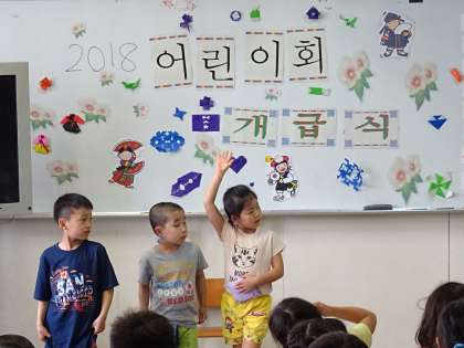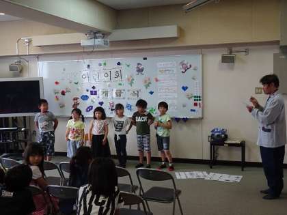 ソンセンニムに名前を一人ずつ呼んでもらい、子ども達は元気よく返事をしてこたえていました。また、これからがんばりたいことを一言ずつ発表しました。