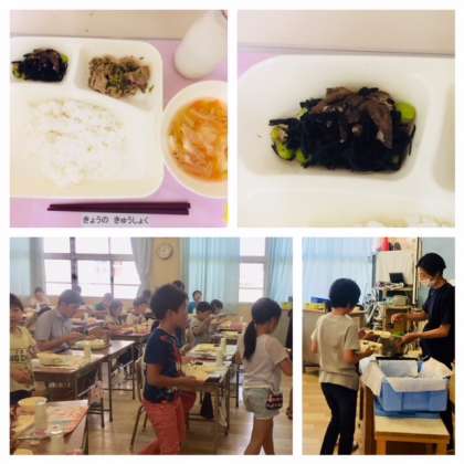 ひじきのいため煮には、ひじき、うす揚げ、むき枝豆(冷凍枝豆をサヤから出したもの)を加えています。(調味料は毎月の献立表をご参照下さい。)