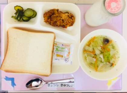 「じゃがいものミートグラタン」は、挽肉がたっぷりと入った手作りのミートソースと、食べやすく切ったじゃがいもを合わせて調理し、オーブンで焼いて仕上げています。子どもたちに大人気の献立です。