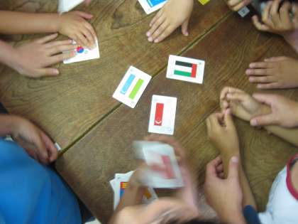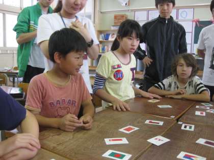 後半は国旗のかるたでした、読み札にはそれぞれの国の特徴がかいてあり、「人口が一番多いくに」「はい!中国!」「正解」大人も子どもも楽しんで、あっという間の45分間でした。