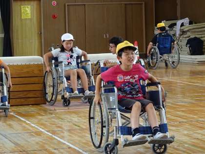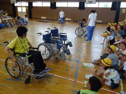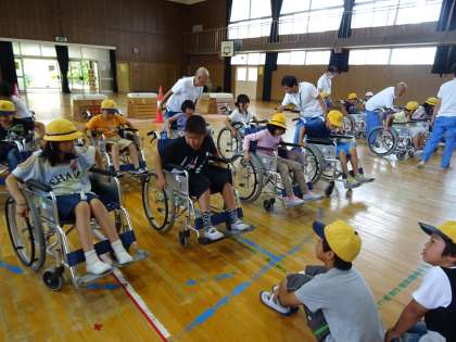 講師の方をお招きして、車いす体験をしました。車いすの生活で困っていることなどをお話ししていただいた後、実際に子どもたちが乗りました。段差や地面など、普段は気にならないところでも、車いすだと難しいことがわかりました。