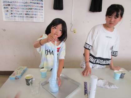 洗濯のりやホウ砂などの材料をはかり、それぞれ水に溶かして、混ぜ合わせると・・・