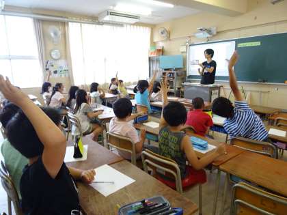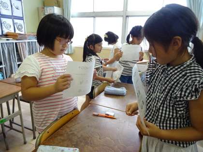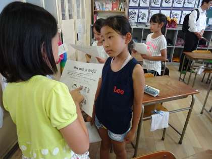 中学年の活動は、デザートの値段を英語で伝えるゲームをしました。いくつかあるデザートの中で、自分が知っている値段は一つ。「How much?」たくさん友達に声をかけて、値段を聞くことができました。